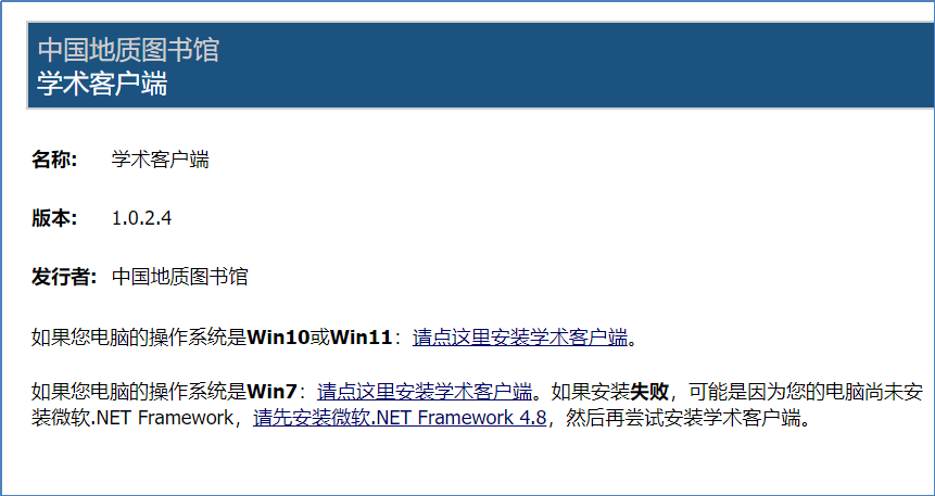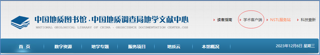 1.登录中国地质图书馆官网(www.cgl.org.cn),在界面的右上角点击“学术客户端”,进入下载页面: