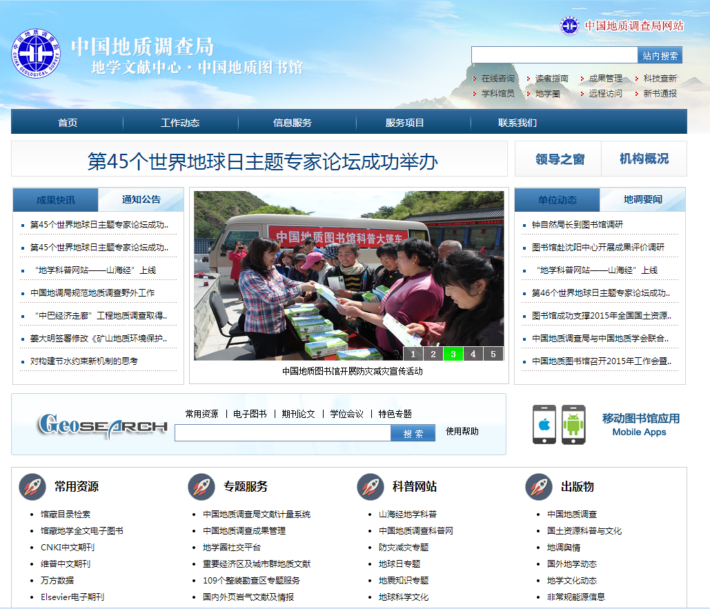 地调局下发《关于外网首页统一改版的通知》文件,要求各局属单位统一门户网站首页。按文件要求我们已建设新的单位门户网站,突出项目成果、单位动态,以及为部局的支撑性服务,同时将原门户网站逐步打造成专门的文献服务网站。 目前,新版单位门户已经按文件要求基本建成,现已上线,访问地址:http://www.cgl.cgs.gov.cn/