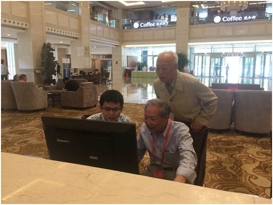 为郑绵平院士(右1)和赵文津院士(后排站立者)现场演示知识服务系统