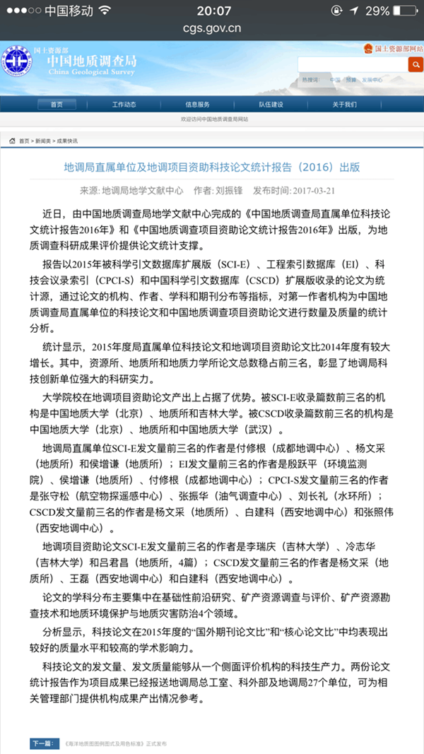 报告以2015年被科学引文数据库扩展版(SCI)、工程索引数据库(EI)、科技会议录索引(CPCI-S)和中国科学引文数据库(CSCD)扩展版收录的论文为统计源,通过论文的机构、作者、学科和期刊分布等指标,对第一作者机构为中国地质调查局直属单位的科技论文和中国地质调查项目资助论文进行数量和质量的统计分析。