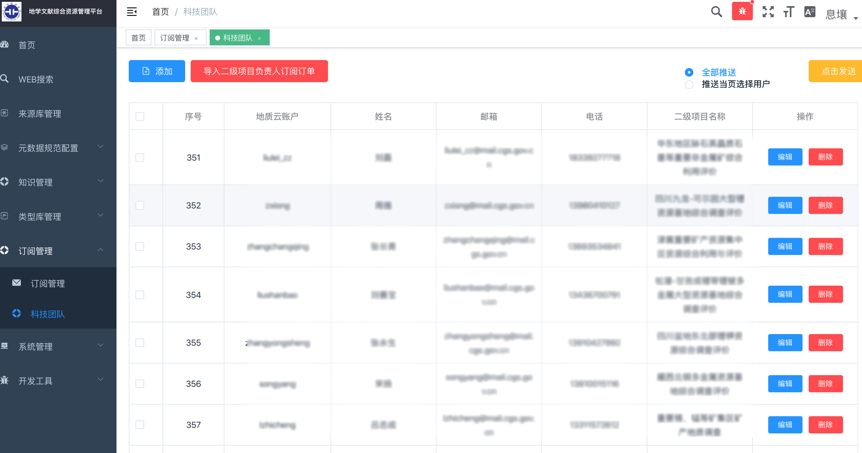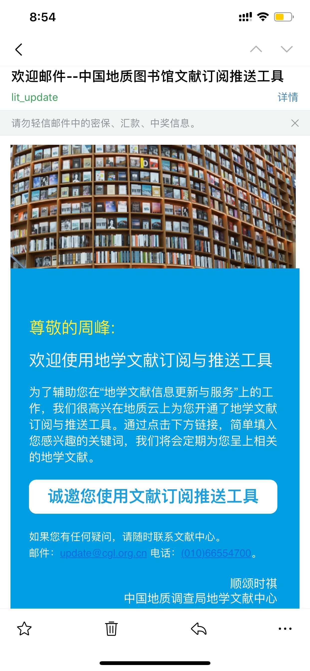 该工具依托“地质云”平台,通过邮件和短信两种方式推送。二级项目负责人也可以自由订阅感兴趣关键词,系统将根据所提交订阅关键词及时发送最相关最新文献列表至订阅者邮箱。该工具服务地址可通过地质云网站进入,或访问http://feed.cgl.org.cn。