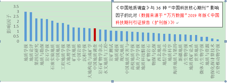 如图所示,已超过列表中22种核心期刊的影响因子。另据“万方数据”2019年版“中国科技期刊引证报告(扩刊版)”,《中国地质调查》期刊影响因子为1.305,同样,如果将其与地质学类36种 “中国科技核心期刊”影响因子比对,也已超过23种(如图)。
