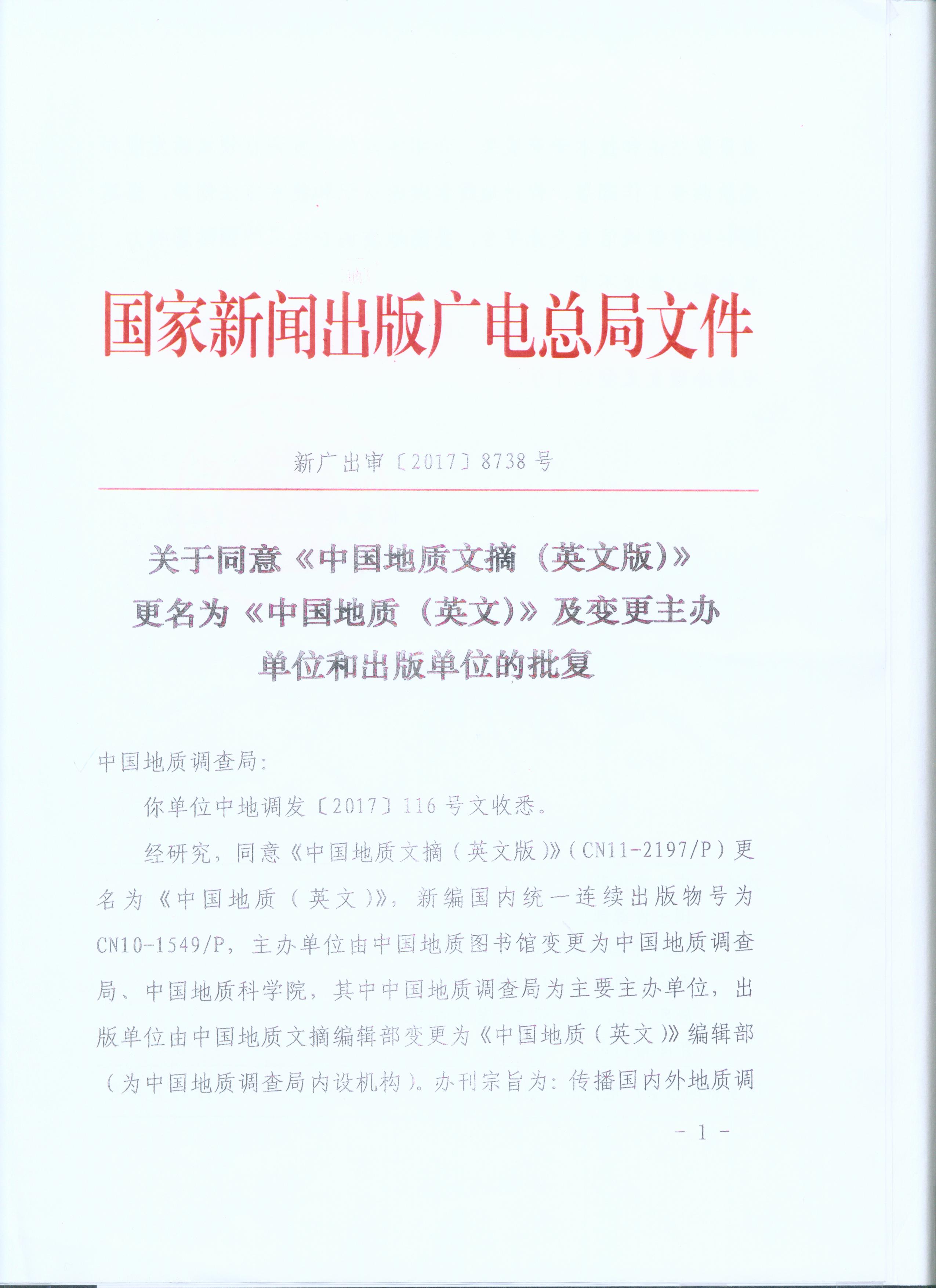 2017年11月27日,《中国地质(英文)》期刊获得由中华人民共和国国家新闻出版广电总局颁发的《中华人民共和国期刊出版许可证》,这标志着《中国地质(英文)》期刊的变更工作正式完成。