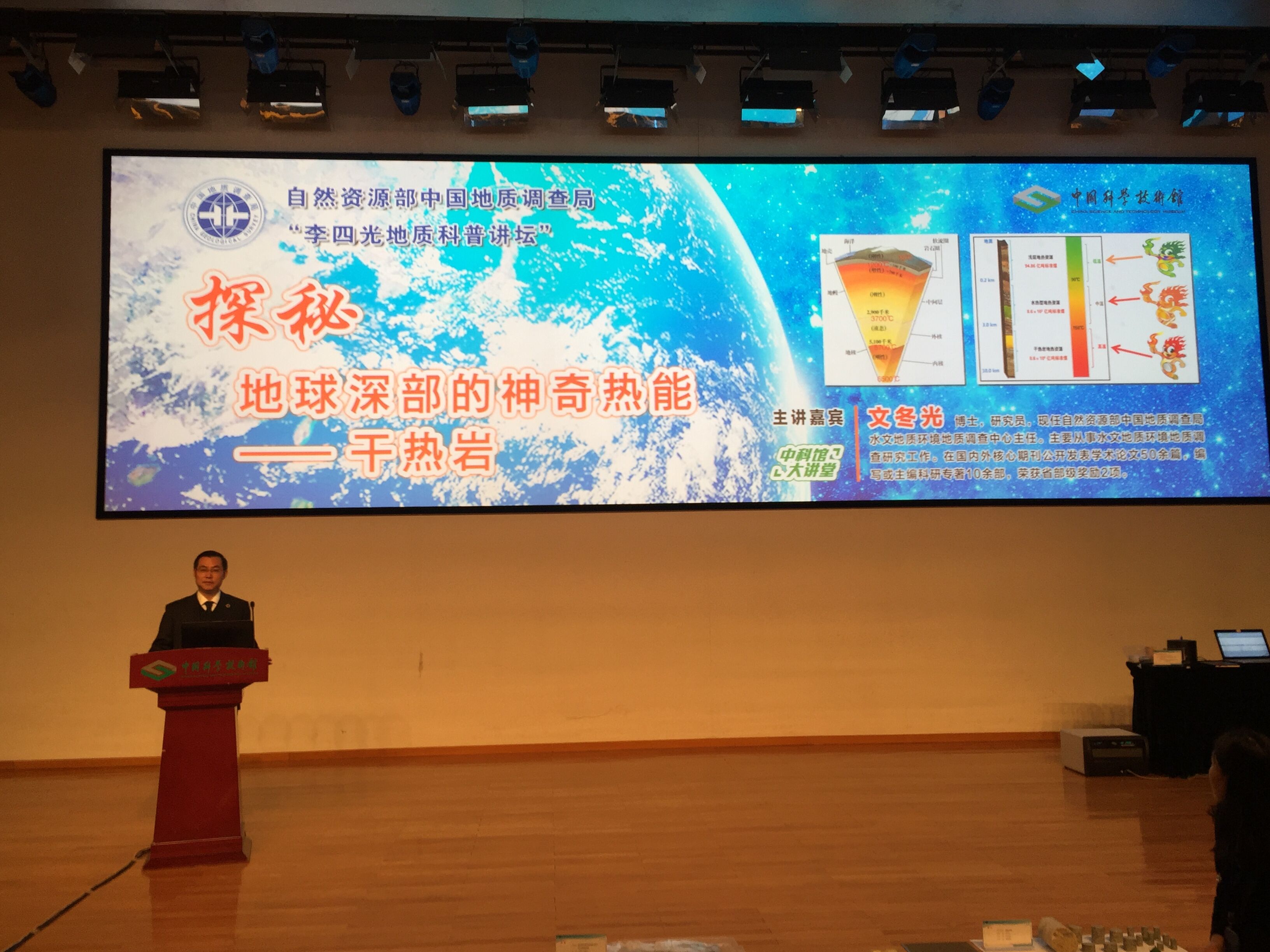 12月1日, 由自然资源部中国地质调查局主办,自然资源部中国地质调查局地学文献中心(中国地质调查局科普办公室)、自然资源部中国地质调查局水文地质环境地质调查中心承办的“李四光地质科普讲坛” 第四期在中国科学技术馆举办,地调局水环中心主任文冬光作了“探秘地球深部的神奇热能——干热岩”主题讲座。中国地质调查局相关人员及现场听众300多人参加了此次活动。