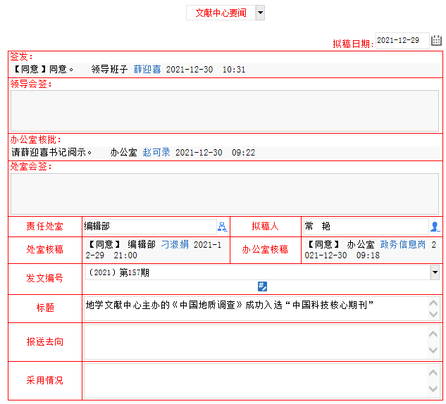 在2021年12月27日举行的“中国科技论文统计结果发布会”上,由中国地质调查局主管,中国地质调查局地学文献中心主办的《中国地质调查》成功入选《中国科技期刊引证报告》(核心版),成为“中国科技核心期刊”。这是《中国地质调查》自2014年创刊以来首次进入“中国科技核心期刊”阵营。《中国地质调查》的成功入选是期刊质量和影响力大幅提升的具体体现。