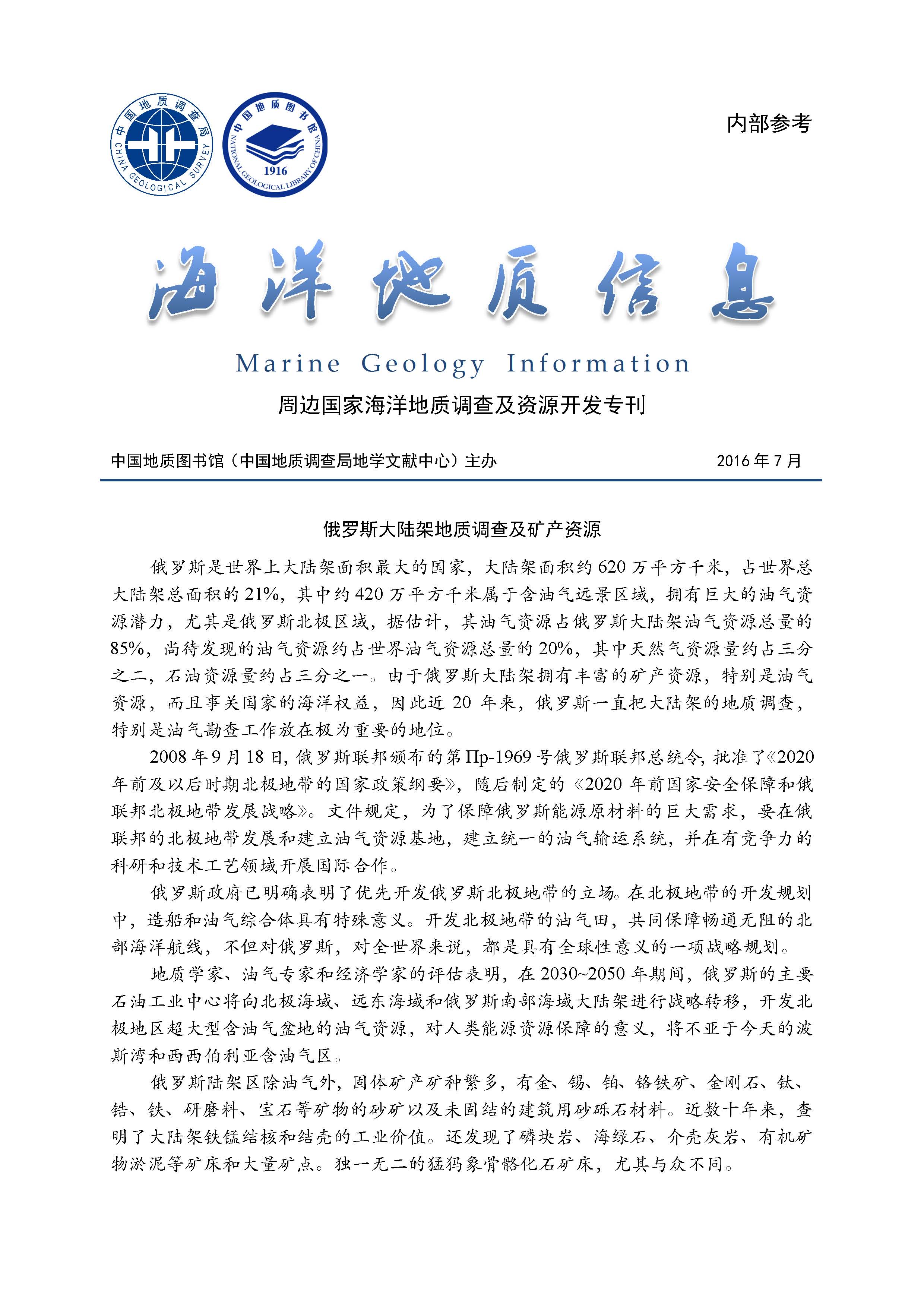 近日,中国地质调查局文献中心在通过对俄罗斯大陆架地质及海洋资源开发等方面的相关文献系统监视和跟踪的基础上,编写完成了《周边国家海洋地质调查及资源开发》专刊,该专刊是内部刊物《海洋地质信息》的专题报道之一,本次专刊主题是“俄罗斯大陆架地质调查及矿产资源”。
