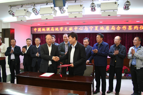 关山度若飞,春雨促发展。为充分发挥地学文献资源和信息情报优势,更好地服务国家“一带一路”倡议和宁夏经济社会发展,4月7日上午,中国地质调查局地学文献中心主任刘延明、办公室主任赵可录、文献情报室主任吕鹏等一行5人赴宁夏回族自治区地质局协商和签订战略合作协议。中心刘延明主任、宁夏地质局徐占海局长分别代表双方签订了合作协议书,双方经友好协商,双方将在多领域、全方位携手合作、共同发展,整个合作签定仪式在极其友好、非常隆重的氛围中进行。