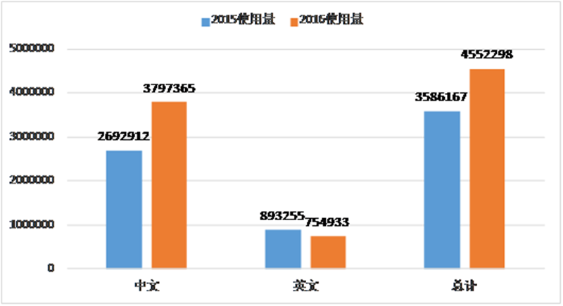电子资源使用量呈逐年增长趋势。中文数据库使用量增长尤其突出。地学文献中心2016年采购了28种电子资源,使用量达到4532834篇/次,比2015年使用量增长26.94%。