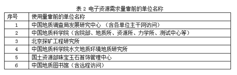 电子资源使用情况分析报告中资源的检索量、下载量统计客观、具体地反映出读者对电子资源需求的程度和偏好,电子资源需求量靠前的单位名称见下表。