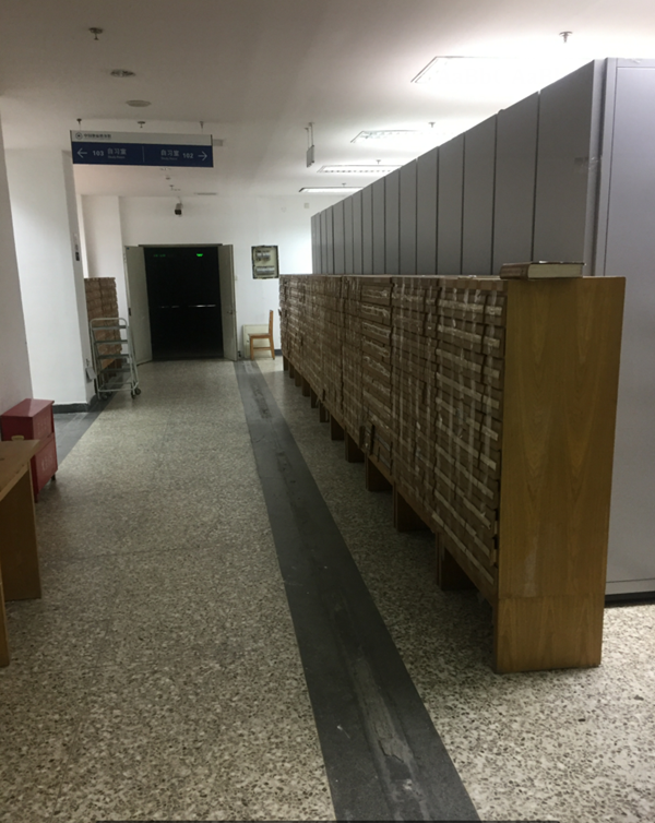 2016年开始,中国地质调查局地学文献中心文献服务室启动租用库房收藏书刊的清理及回迁工作,截止到2017年4月已经将所有需要回迁的书刊及物品全部运回文献中心。由于中心库房面积的局限,待处理文献较多,而且租用库房租期已到,因此回迁书刊、报纸、目录柜只能暂时堆放在一层密集库中。