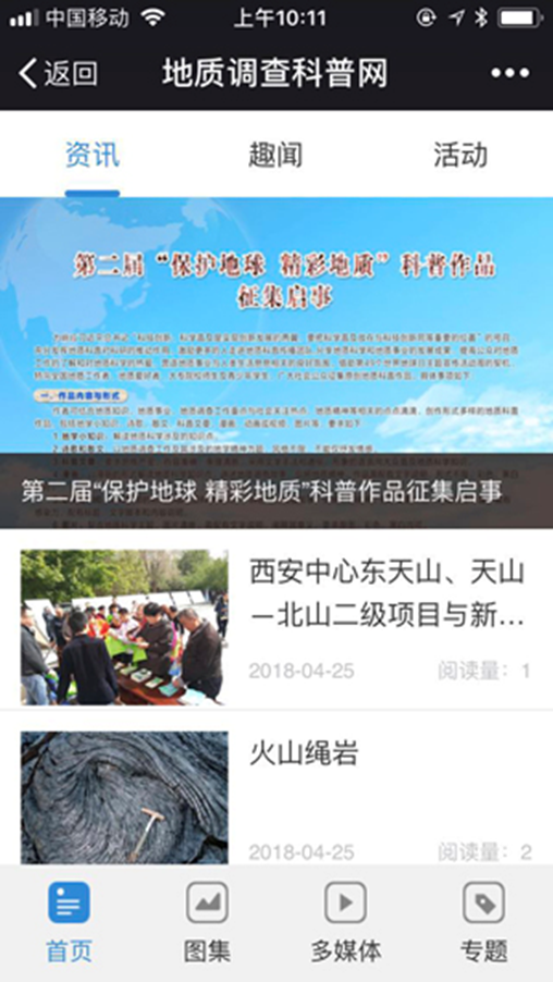 4月22日,由中国地质图书馆(中国地质调查局地学文献中心)运维的地质调查科普网站手机版正式上线。继2017年世界地球日期间地质调查科普网站2.0上线之后,经过不断的技术更新,网站实现了从“桌面”到“指尖”的升级,访问更加便捷。至此,地质调查科普网络宣传平台的构架基本完成。