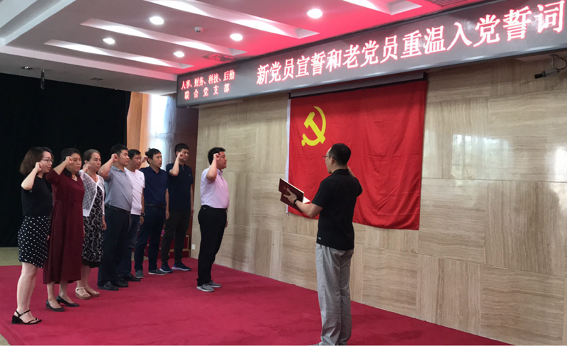 为迎接“七一”的到来,文献中心人事-财务-科技-后勤联合党支部开展了新党员宣誓活动。宣誓仪式简洁不失庄严,党员们衣着整洁,精神饱满,在领誓人的带领下,新党员庄严宣誓,老党员则再次重温了这令人心情激动的时刻。宣誓后,新党员与大家分享了自己的喜悦心情,表示要在今后的工作中践行誓词,再接再厉,继续以合格党员的标准要求自己,请大家监督批评,争取更大的进步。支部积极分子也借此机会谈了观摩感受并汇报了个人近期认识,表示要加快脚步,努力奋进,向党组织靠拢。