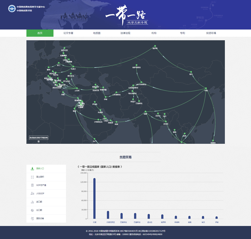 网站展示了“一带一路”65个沿线国家(包括中国)的国情、自然资源、投资环境等基本信息、地质图、法律法规、机构、专利、论文专著等六大板块。