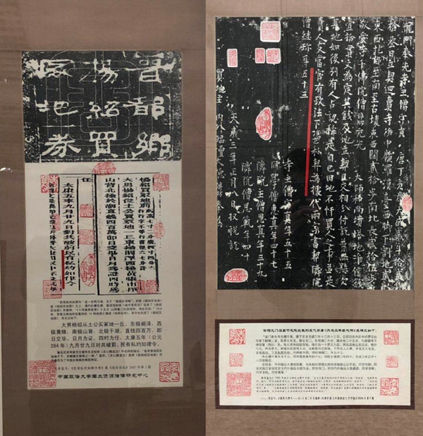 “民有私约如律令”这一合同习语,公元284年即刻于《晋杨绍买地莂》)上,比西方的民事契约出现还早了三百年。1918年﹐罗振玉将他所收集到的19种地券汇编成《地券征存》,其中也包括了《晋杨绍买地莂》,是中国民间契约与土地买卖合同研究最重要的历史文献之一,除此之外《晋杨绍买地莂》在书法艺术上亦是不可多得的精品,是西晋隶书碑刻的代表作。《天成三年买地碑》亦属具有特殊历史价值的重要碑刻作品。
