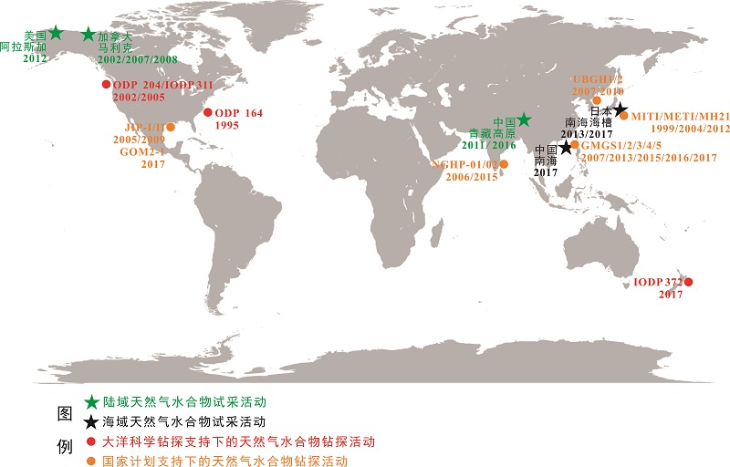 图1 全球主要天然气水合物钻探与试采活动分布示意图