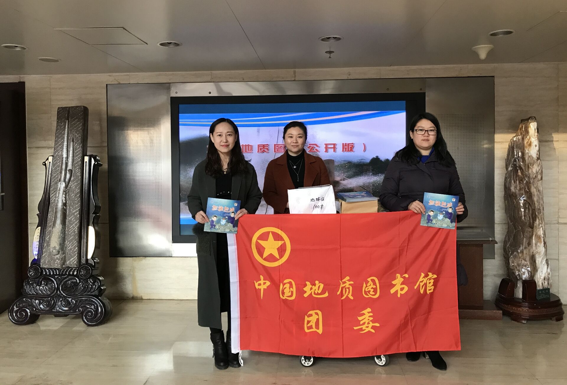 经详细调研并充分准备科普读物后,2018年1月19日,地质图书馆科普室携团委共组织赠送儿童科普读本:《嗨!恐龙》、《燃烧的冰》、《畅游盐湖》共150册;大众科普读物:《热河生物群》(精装辞典读物)20册,《罗平、关岭生物群》(精装辞典读物)48册,《地质灾害画册》80册,《地球日宣传册》100册,《土地日宣传册》200册。这一系列地学科普读物走进基层,对夏潭村的村民及儿童普及地学科普知识、提升地学学习兴趣、提高地灾防治意识起到积极的效果。