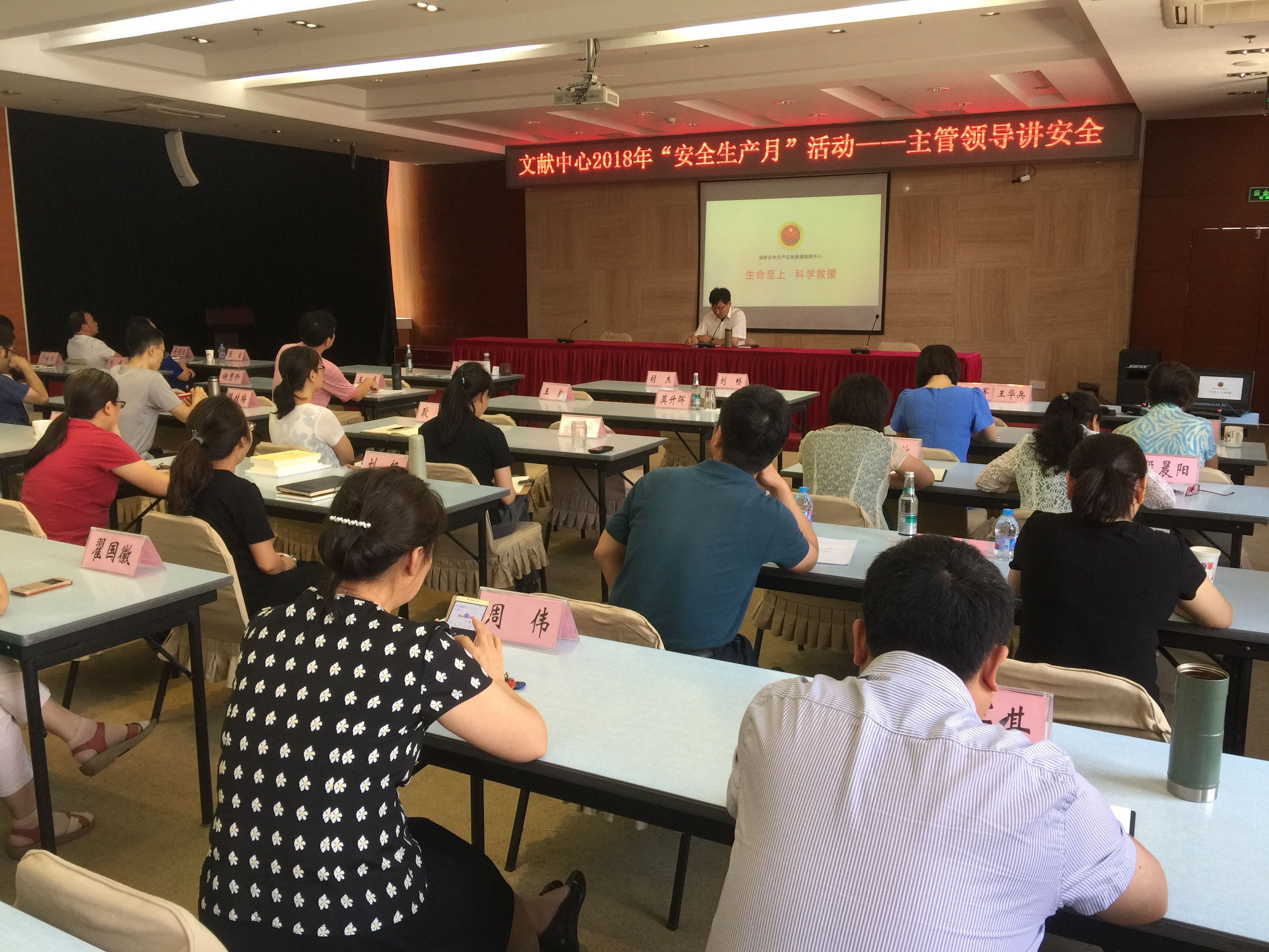 按照部局通知精神及中心安全生产月方案的部署,文献中心开展了一次全员安全生产培训。由中心安全生产第一责任人刘延明主任进行了主题授课,向全体职工传达了国家、部、局的安全生产要求及上半年安全形势,强调中心要全面贯彻安全生产责任制,全体职工牢固树立“生命至上,安全发展”的意识,为中心发展创造安全条件。随后,全员集中观看学习了安全警示片《隐患直击》,从身边做起,从自己做起,排查隐患,保中心平安。在疏散演习中,职工与读者都能够积极参与,能依消防广播的指示有序安全撤离,受训达百余人,整体效果较好。最后,由地质大学消防应急部门人员为大家讲解了消防知识,指导了灭火器的实际操作,使得全体职工从思想到行动上,都得到了教育,切实提高了安全生产意识,增强了应急处置能力。