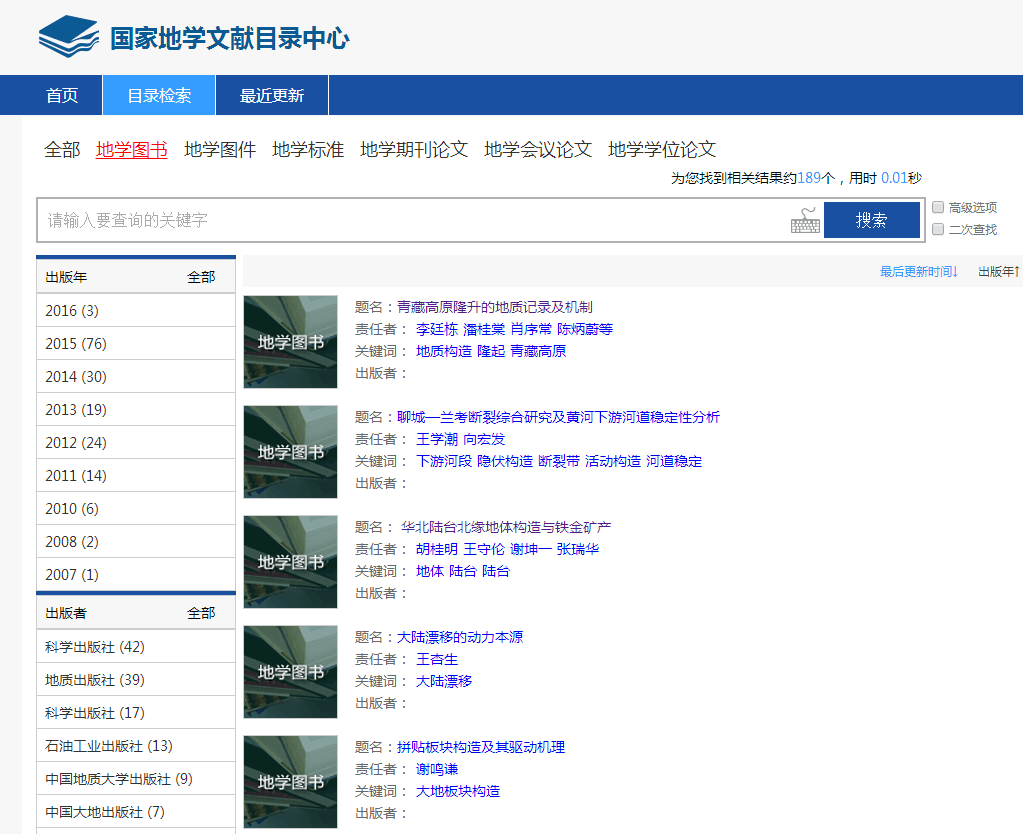此项工作是以地学文献中心已有的文献数据为基础集成外部资源,依据《地学文献目录数据采集技术要求》为标准,对地学文献资源的产生、位置、责任单位、共享范围及更新维护方式等方面信息进行目录聚合,同时形成地学专业的国家总书目。