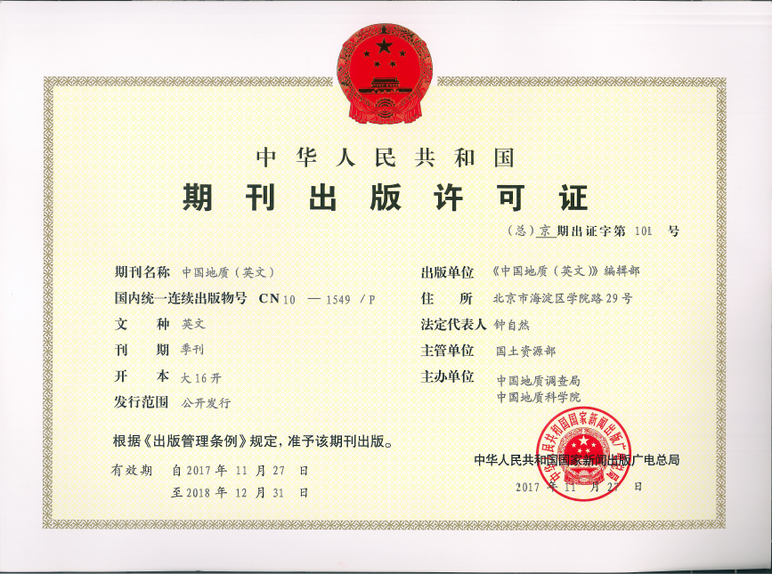 20171127日,《中国地质(英文)》期刊获得由中华人民共和国国家新闻出版广电总局颁发的《中华人民共和国期刊出版许可证》,这标志着《中国地质(英文)》期刊的变更工作正式完成。