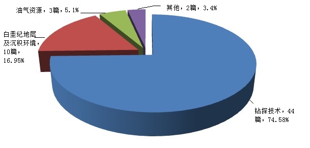 文献计量结果显示:在59篇论文中,钻探技术类44篇,占74.58%;白垩纪地层及沉积环境的10篇,占16.95%;油气资源的有3篇;其他2篇。文献领域分布情况见下图: