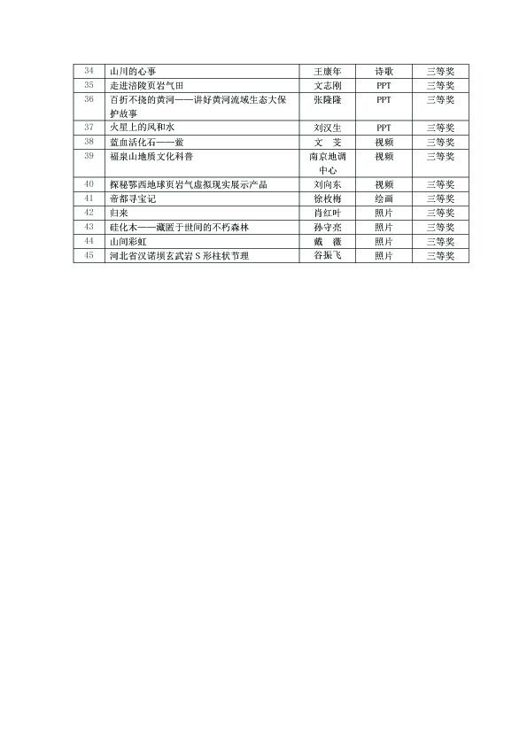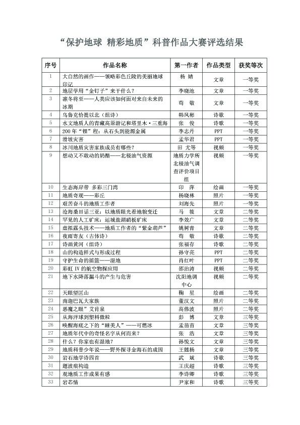 本次作品征集历时3个多月,在中国地质学会地质科普工作委员会、中国矿业报社、中国地质大学(北京)等单位的支持下,截止9月底,共征集作品210件,其中文章37篇、诗歌44首、视频15个、课件14个、绘画8套、摄影作品92张。60余家单位的近百位作者参与了本次作品大赛。在初选基础上,专家从作品与地质工作及其成果的相关性、作品的创新性、通俗性、艺术性、结构层次等方面进行评选,最终45件优秀作品脱颖而出。