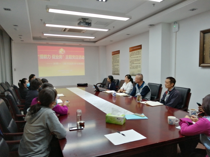 为了进一步提升整体的咨询服务能力,尤其是年轻人的业务能力,结合处室业务工作需要,2019年新入职的孙君一博士为大家做了“图书馆资源与服务”专题发言。首先对中心的历史沿革和主要业务板块进行了介绍,然后重点介绍了中心馆藏资源概况,特别是一些特色数据库利用情况,最后介绍了中心能够提供的文献服务内容和服务方式。