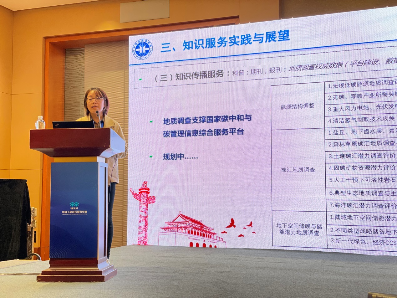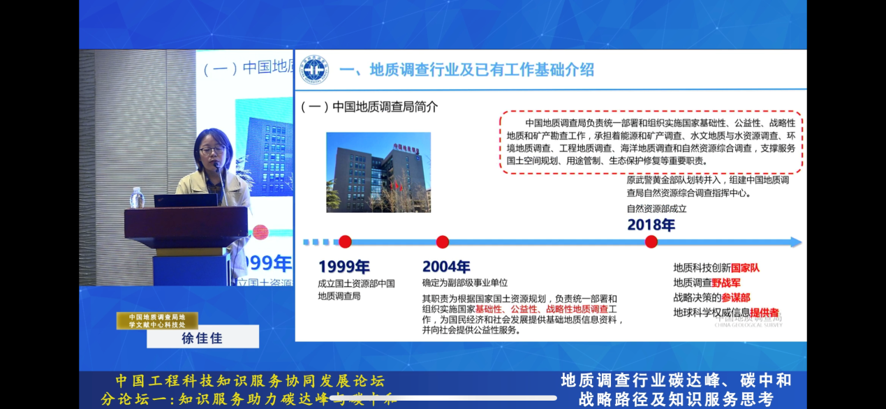 下午的“知识服务助力碳达峰碳中和”分论坛深度解读和探讨国内材料、能源、交通、地质等领域知识服务助力碳达峰碳中和目标的总体情况。地学文献中心科学技术处徐佳佳副处长做了题为“地质调查行业碳达峰、碳中和战略路径及知识服务思考”的报告,报告从地质调查行业及已有工作基础、碳达峰碳中和路径思考、知识服务实践与展望三个方面展开,在开展基础文献、信息资讯、知识传播与战略咨询服务方面,重点围绕碳达峰知识服务相关工作取得的系列成果进行介绍,受到与会专家的关注。