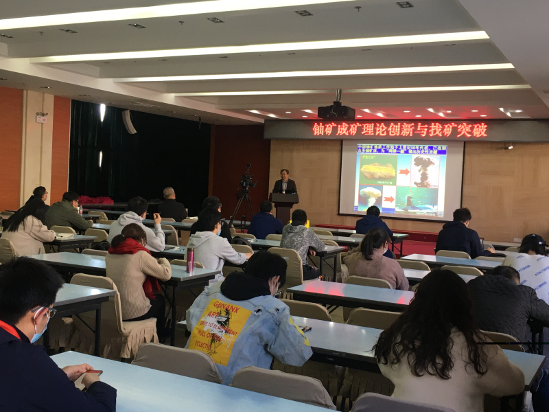 李子颖院长首先阐述了铀矿需求背景及国内外铀矿类型和分布特点,重点对热液型和砂岩型铀矿成矿理论的创新与找矿突破成果进行了详细讲解。报告会后,李子颖院长与多名师生针对我国核电发展与铀矿勘查之间的供需关系、大数据和人工智能等新技术新方法在铀矿勘查中的应用前景、热点成铀理论找矿成果及地浸法中新技术对注入液流向控制等问题进行了深入探讨。