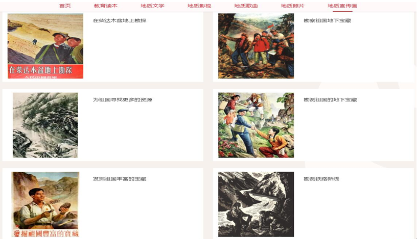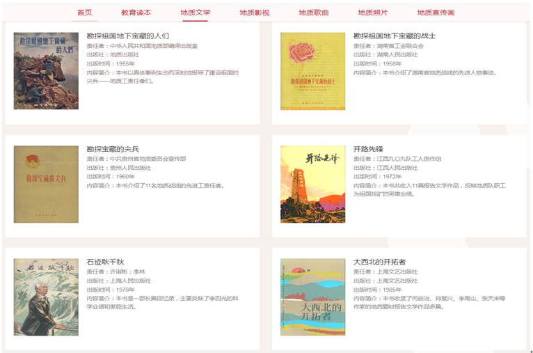 本次展览通过网络展示和平台互动的模式,分为党史特色书籍展、地质文学作品展、地质影视作品展、地质歌曲作品展、野外工作风貌展、珍贵宣传图片展等六部分内容,近500件文献作品。