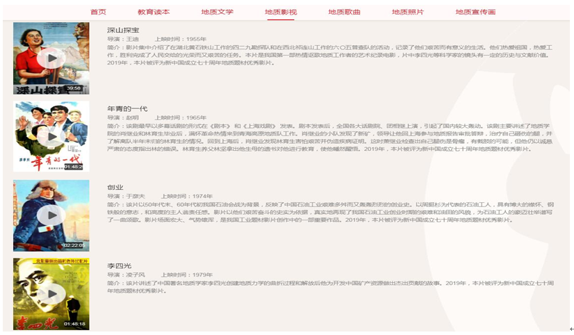 地质影视作品展集中介绍了20部优秀地质题材影视作品,包括鼓舞一代代地质人的《年青的一代》《深山探宝》《创业》《李四光》《男儿要远行》和《世界屋脊的太阳》等多部新中国成立七十周年地质题材优秀影片。