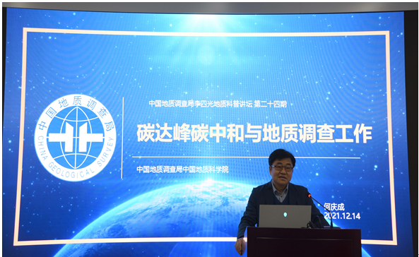 12月14日,“李四光地质科普讲坛(第24期)”在中国地质调查局地学文献中心科普展厅举行,中国地质科学院研究员何庆成作了题为“碳达峰碳中和与地质调查工作”的科普讲座。本期讲坛由中国地质调查局科普办公室(地学文献中心)与中国地质科学院联合承办。讲座通过Welink会议和地学文献中心哔哩哔哩直播大厅同步直播,中国地质调查局系统干部职工、社会公众近1900人聆听了讲座。