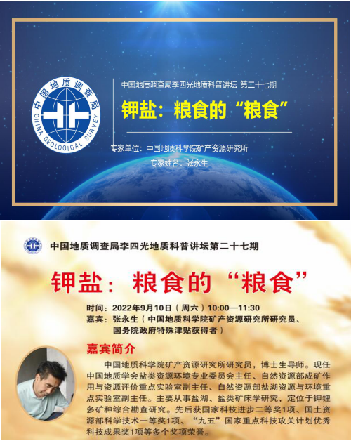 9月10日,为迎接2022年全国科普日,第27期“李四光地质科普讲坛”以线上方式成功举办。中国地质科学院矿产资源研究所研究员张永生受邀作了题为“钾盐:粮食的‘粮食’”的科普讲座。本期讲坛由中国地质调查局、中国科学技术馆主办,中国地质调查局地学文献中心、中国地质科学院矿产资源研究所承办。