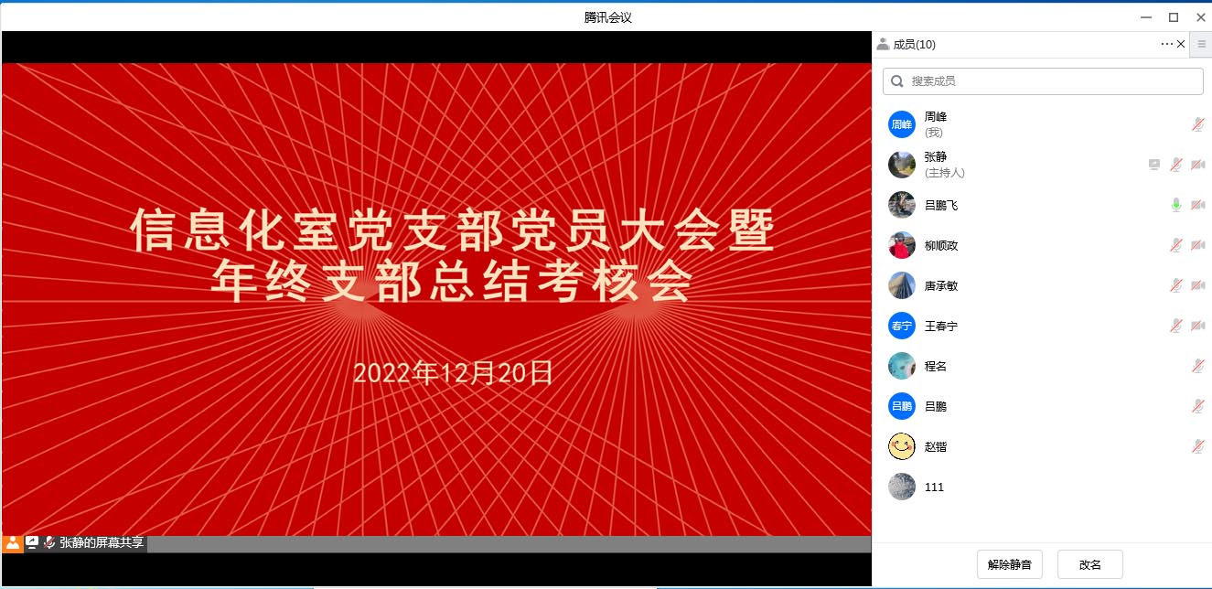 2022年12月21日上午,中国地质调查局地学文献中心信息化室党支部召开2022年度支部工作总结大会,会议采取线上会议形式举行,中心党委副书记、副主任(主持工作)唐承敏同志参会指导,会议由党支部书记王春宁主持,支部全体党员参加,两名群众列席。