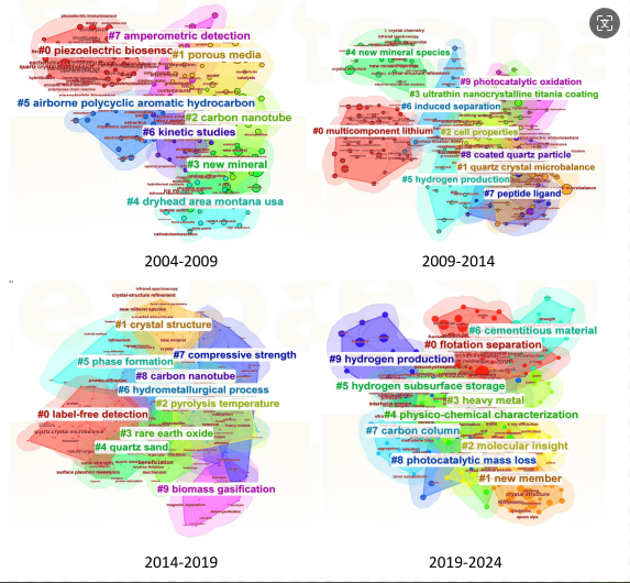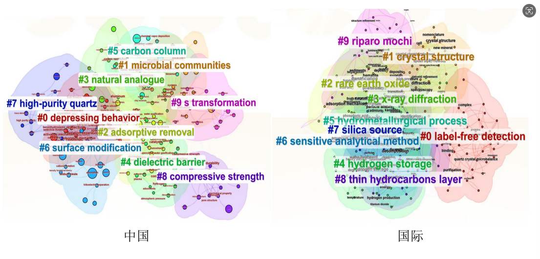 分析结果表明,高纯石英研究论文整体发文趋势呈现迅速上升态势,中国已经成为年发表论文数最多的国家;从研究领域来看,化学领域及地球化学与地球物理学、矿物学排名第一。从资助角度可看出,加拿大为高纯石英研究提供较为完善的资助组织体系;从研究机构可看出,排名前三的分别是俄罗斯科学院、法国国家科学研究中心(CNRS)、中国科学院,其中前十高频机构中有三个机构来自中国;从合作角度来看,国际高纯石英研究科研人员合作较为密切,但中国科研人员参与国际合作较为缺乏;从被引频次来看,该领域里有一定影响力的论文数量和占比较高。报告进一步分析研究热点,发现高纯石英的研究经历了从成矿地质环境,到结构特征,再到提取精制技术,最后到实际应用的逐步递进的演变趋势,且近十年来中外研究热点主要区别在高纯石英提纯的方法技术方面。这些结论以期为我国在高纯石英研究的资金支持、组织保障、国际交流与合作、精制工艺技术攻关等方面提供参考。