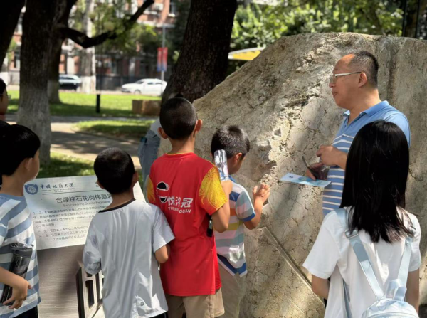 此次科普活动在中国地质大学(北京)的校园和中国地质图书馆内外展开。首先,在户外环节,项目组成员吴西顺博士带领孩子们走进“石头”的世界。他从校园中一块巨大的伟晶岩标本讲起,用通俗易懂的语言生动地讲解了岩石的形成、三大分类(岩浆岩、沉积岩、变质岩)以及它们之间的转化关系(图1)。孩子们通过亲手触摸、仔细观察,直观地感受到了岩石的矿物成分和结构特征,对脚下这片土地的构成有了全新的认识。吴博士的精彩讲解点燃了孩子们对地质学的好奇心,种下科学的“种子”,为他们打开了一扇通往地球科学殿堂的大门。