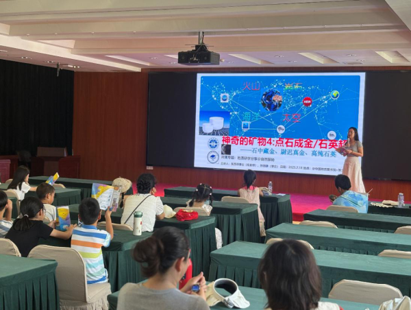 随后,活动转至中国地质图书馆内,一场主题为《神奇的矿物:石英超纯》的科普讲座将活动推向高潮。项目组成员孙丽静博士通过精美的图片和视频,系统地介绍了石英的物理化学特性、全球分布及其在日常生活与尖端科技中的广泛应用(图2)。她特别强调,貌不惊人的石英经过提纯,可以变成纯度高达99.998%以上的高纯石英,成为制造电脑芯片、光纤、太阳能电池板和精密光学仪器的核心材料,是名副其实的“点石成金”。为了加深孩子们的理解,吴西顺博士还现场展示了多块珍贵的石英矿物标本,引导他们近距离观察石英的晶体形态、颜色和透明度等物理特性,并鼓励孩子们动手触摸,进一步增强了学习的趣味性和互动性。
