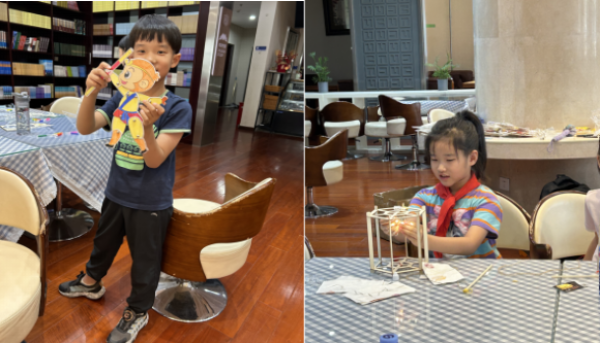 托管研学班精心策划了一场场别开生面的教学趣味活动,活动将深厚的非物质文化遗产体验作为重头戏。在专业老师的指导下,孩子们亲手制作了蕴含传统智慧与健康理念的艾草锤,了解了艾草的药用价值;巧手拼接点亮了象征吉祥的古风宫灯,感受光影交错间的古典韵味;更体验了古老的光影艺术——皮影戏,亲手绘制、组装皮影角色,并在简易幕布后尝试操纵,演绎属于自己的小故事。这些手作体验,让孩子们屏息凝神,沉浸于指尖流转的匠心之美,在一锤一钉、一笔一画、一提一放中,深刻体会到传统技艺的精妙与守护文化根脉的意义,文化自信油然而生。此外,孩子们还亲自动手体验了老北京风车、冰皮月饼、衍纸、驴打滚等经典技艺。