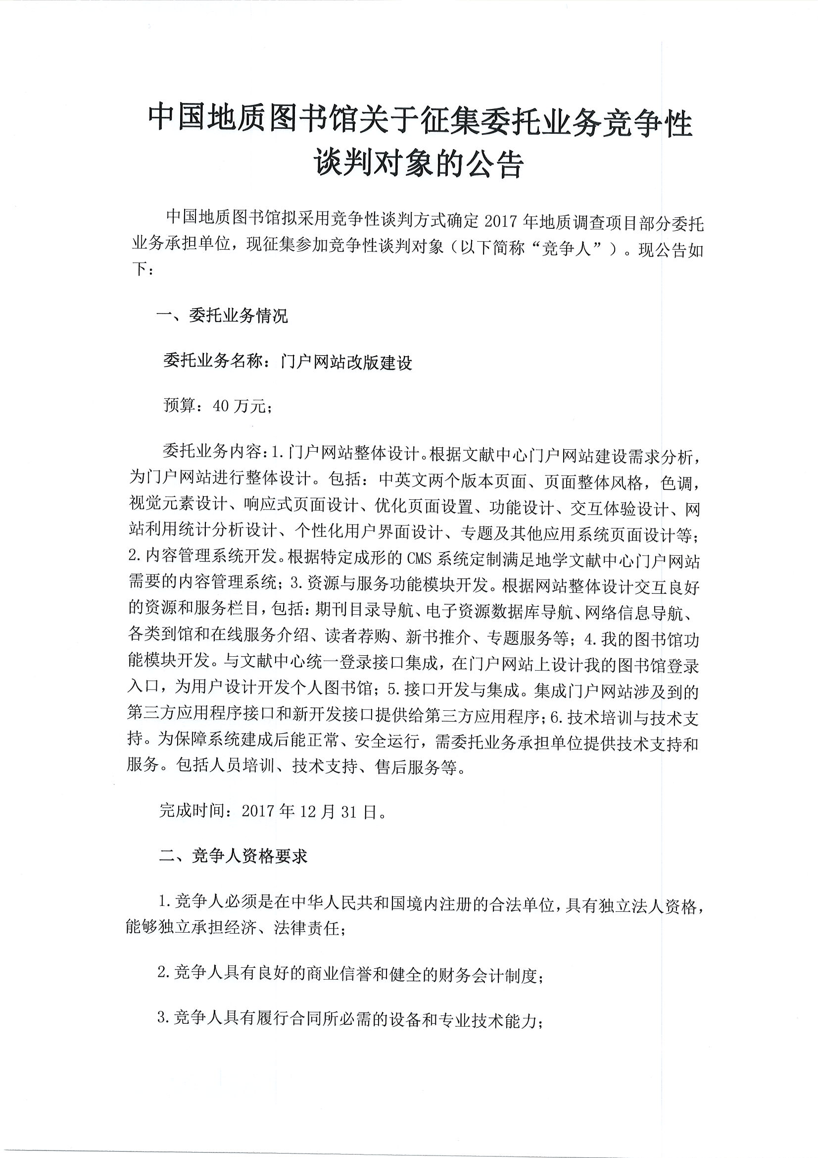中国地质图书馆关于征集委托业务竞争性谈判对象的公告(门户网站改版建设)
