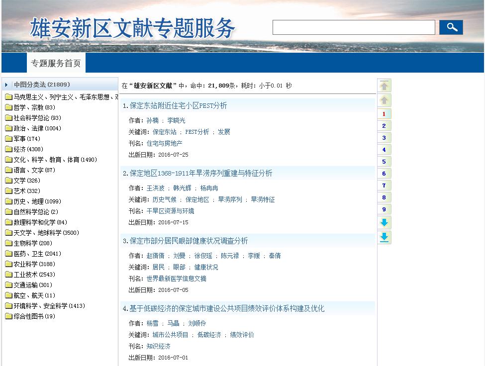 中国地质调查局地学文献中心通过对该地区馆藏资源文献的分析研究,搜集整合出雄安新区文献专题数据库。该专题囊括馆藏雄县、安新县、容城县、白洋淀、保定等地区全学科馆藏图书、期刊文献和华北区域的地学类文献,共两万余篇。其中,电子图书中水工环及地学相关类图书近五百册;期刊文献中水工环及地学相关类近一万篇。