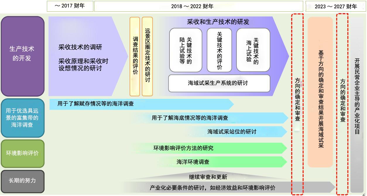 海洋矿产资源包括海底热水矿床、富钴结壳、锰结核和含稀土的海泥。其中,海底热水矿床方面将圈定近5000万t资源量,建立采矿和扬矿全系统,确定适用于不同矿床的选矿和冶炼工艺,提高环境影响评价方法的适用性;富钴结壳方面将继续开展资源调查,利用海底热水矿床的研发成果开发相关采矿技术,设计选矿和冶炼试验厂,开展环境基础调查等;锰结核方面将根据国际海底管理局的规定开展资源调查;含稀土的海泥方面将在内阁府和相关各省的共同推进下,根据战略创新促进计划中的“创新性深海资源调查技术”要求开展研发。