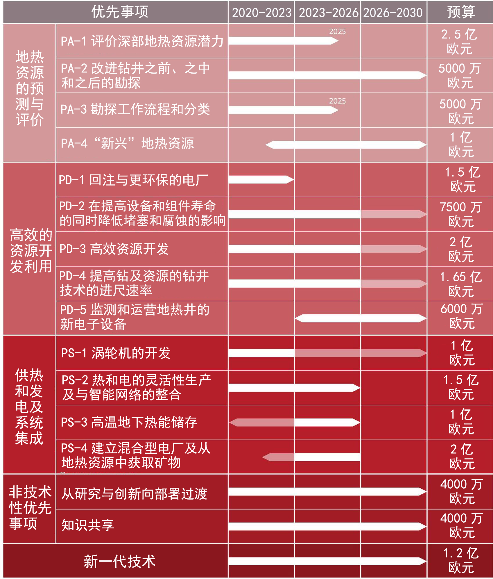 自然资源部中国地质调查局地学文献中心对国际深部地热能开发利用最新进展和成果的持续跟踪,获悉欧洲深部地热技术与创新平台于2019年6月27日发布了《深部地热能实施路线图》报告,明确了开发高性能、低成本和可持续的深部地热能技术的“推进计划”(总预算超18亿欧元),提出了2030年前的任务、目标和工作内容(图1):