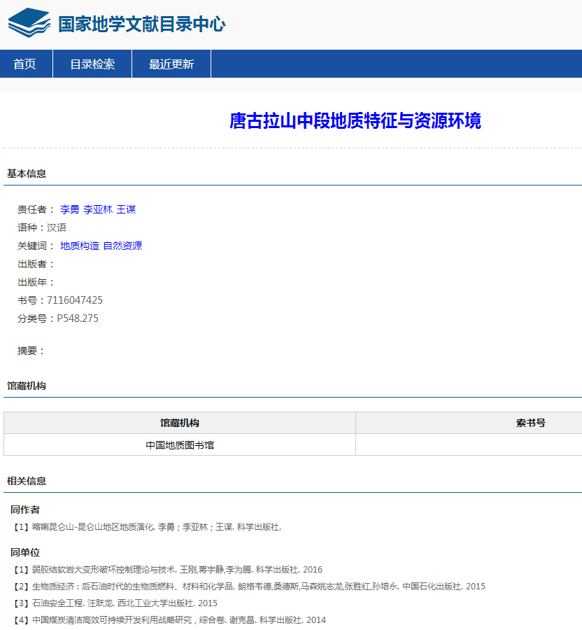 此项工作是以地学文献中心已有的文献数据为基础集成外部资源,依据《地学文献目录数据采集技术要求》为标准,对地学文献资源的产生、位置、责任单位、共享范围及更新维护方式等方面信息进行目录聚合,同时形成地学专业的国家总书目。