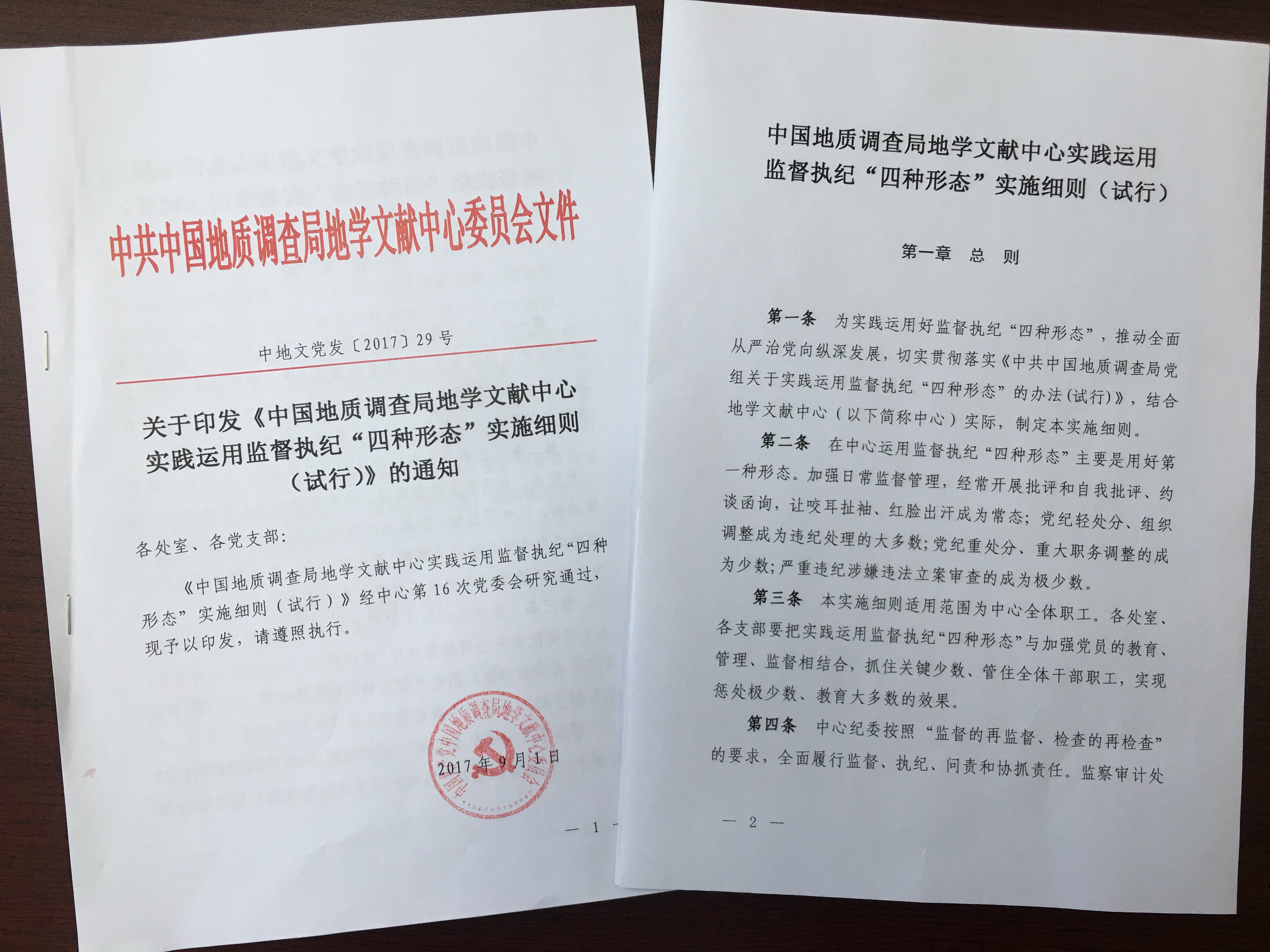 5月《中共中国地质调查局党组关于实践运用监督执纪“四种形态”的办法(试行)》(中地调党发[2017]39号)印发后,中心党委、纪委进行了深入的学习、理解,认为局印发的办法要求明确、可操作性强,具有很好的指导性、实践性。作为基层单位,为促进管党治党横向到边、纵向到底,在与局进行充分沟通的基础上,中心提出结合单位实际制定具体的实施细则。