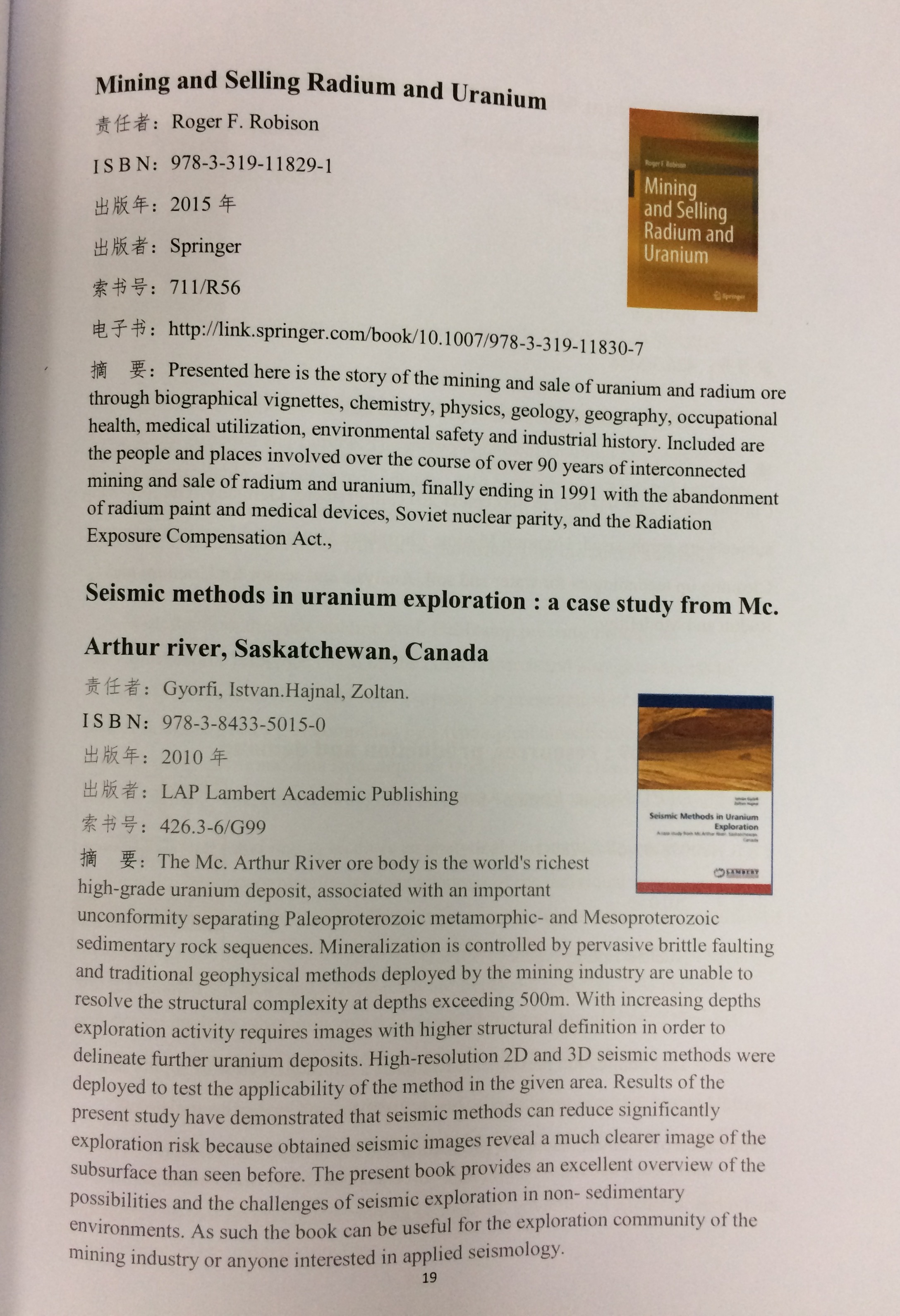本期新书资源推介为铀矿专辑,整合了馆藏最新与铀矿相关的中外文纸本和电子图书,共精选 50 册中文图书、11 册英文图书及24篇PQDT国外博硕论文数据库的学位论文,出版时间为2010-2017年。内容包括国内外铀矿资源、铀矿成矿规律与预测、铀矿勘探的重大进展和突破及铀矿资源潜力评价等图书,会议文集和学位论文,本专辑从图书内容摘要、出版年、馆藏等信息提供检索点,并介绍了获取文献的渠道和方式。文献中心已向中国地质调查局局属单位发送本期推介刊物。