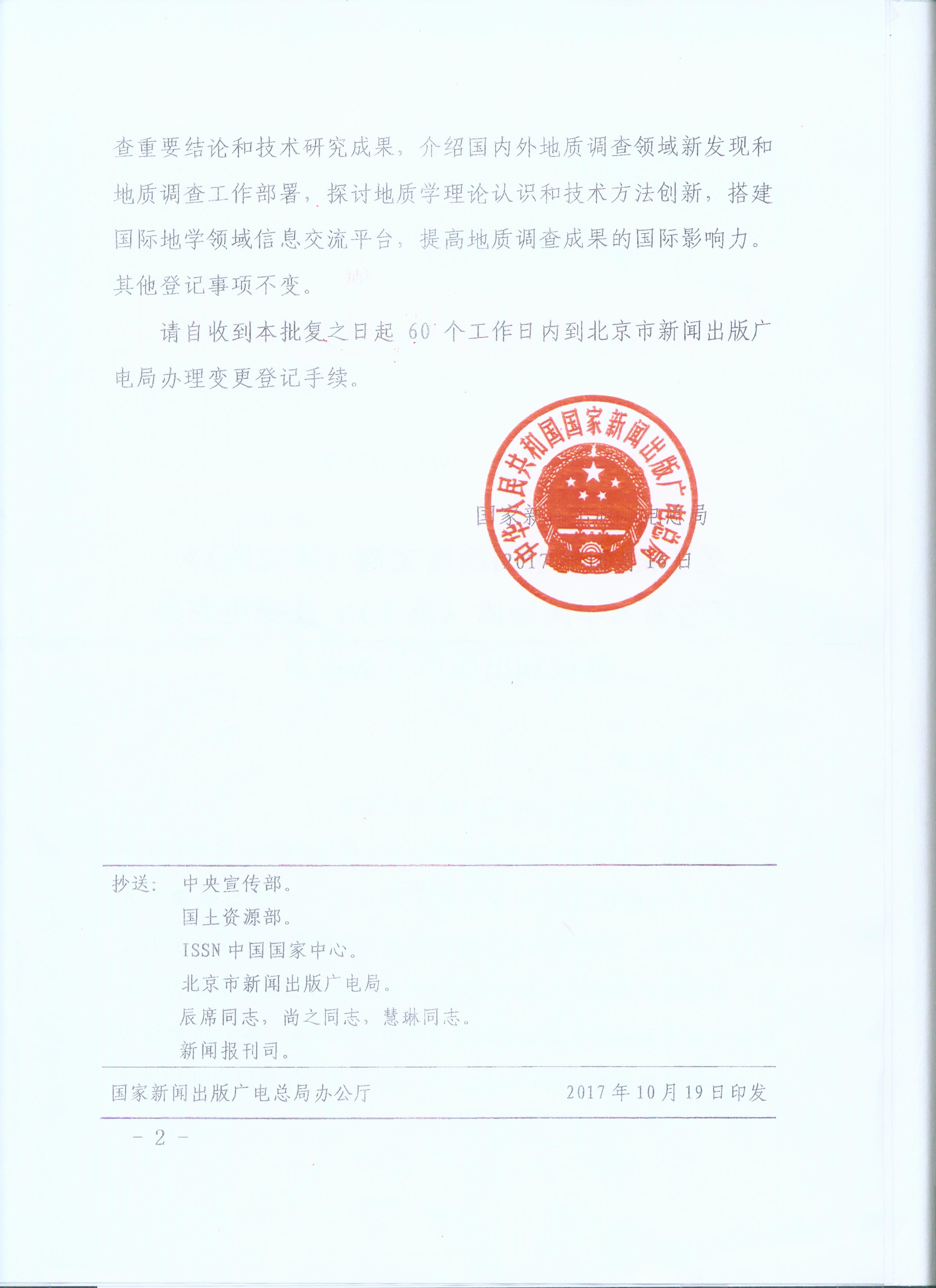 2017年11月27日,《中国地质(英文)》期刊获得由中华人民共和国国家新闻出版广电总局颁发的《中华人民共和国期刊出版许可证》,这标志着《中国地质(英文)》期刊的变更工作正式完成。