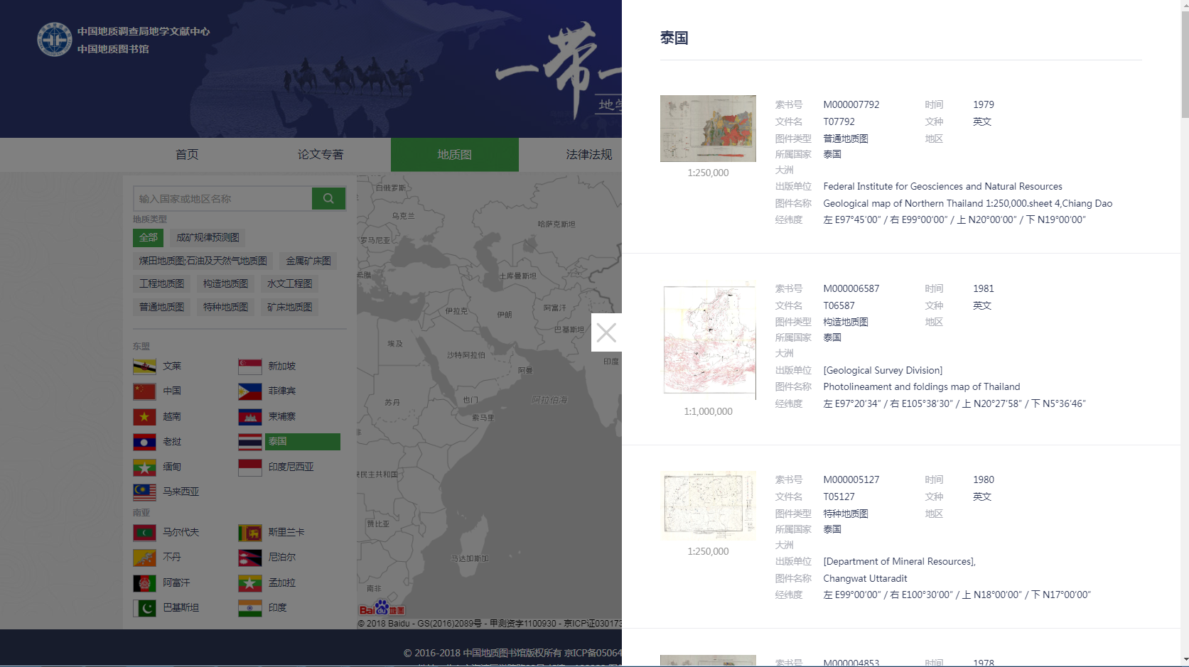 地质图栏目:提供沿线国家地质缩略图及相关信息。目前展示了50多个国家的地质缩略图近600幅,包括普通地质图、构造地质图、矿床地质图、水文工程地质图、成矿规律预测图、煤田地质图、石油及天然气地质图、及其他特种地质图类;