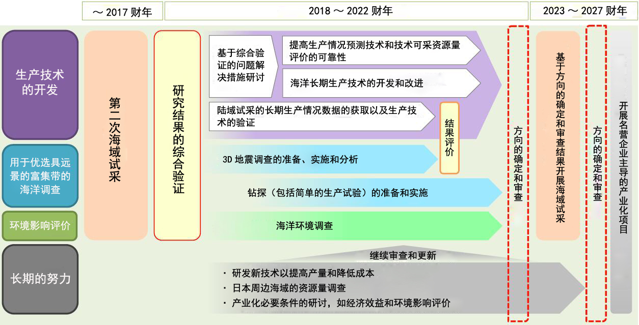 天然气水合物包括砂层型水合物和表层型水合物。其中,砂层型水合物方面将开展长期生产技术的开发和陆域试采、日本周边海域的勘查与钻探、海洋环境调查等;表层型水合物方面将开展采收技术调研成果的评价、采收和生产技术的研发及海底条件调查、海洋环境调查等。
