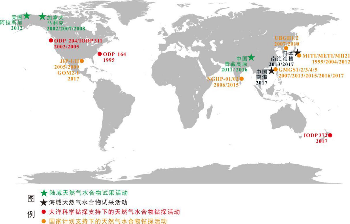 图1 全球主要天然气水合物钻探与试采活动分布示意图