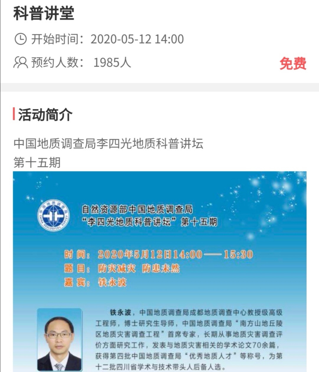 为了纪念第12个防灾减灾日,由自然资源部中国地质调查局主办,自然资源部中国地质调查局地学文献中心、自然资源部中国地质调查局成都地质调查中心承办的第15期 “李四光地质科普讲坛”在线开播,成都地质调查中心的铁永波教授受邀作“防灾减灾 防患未然”的专题科普讲座。社会各界地学爱好者及相关专业院校师生,以及乌蒙山小学、成都市人民北路小学、成都市少城小学、赣县五云镇中心小学、赣县城区第四小学、宣威五中、昆明市第三中学等学校师生近三千人观看。