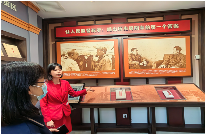 关于新中国如何跳出周期律的问题,我党主要领导人在进京之前在春意盎然的西柏坡就已经在思考和讨论。1945年7月毛泽东和黄炎培二人在延安窑洞有一次对话。黄炎培提出中国历史进程中政权轮替存在:“其兴也勃焉,其亡也忽焉”的“周期率”现象。毛泽东自信地回答:“我们已经找到新路,我们能跳出这周期率。这条新路,就是民主。”1949年3月23日,毛泽东等中央领导同志率领中共中央机关和中国人民解放军总部,离开西柏坡,向北平进发。毛泽东说:“今天是进京的日子。进京‘赶考’去。”周恩来说:“我们应当能考及格,不要退回来。”毛泽东说:“我们绝不当李自成,我们都希望考个好成绩。”习近平2023年2月1日指出,毛泽东同志在延安窑洞里给出了第一个答案,就是“让人民来监督政府”;经过百年奋斗特别是党的十八大以来新的实践,党又给出了第二个答案,这就是“自我革命”(《全面从严治党探索出依靠党的自我革命跳出历史周期率的成功路径》)。大家聆听着经典的历史论断,深深为之叹服。参观过程中,大家积极踊跃参与体验,表现出很高的热情,在工作人员的指导下保存了观看红色教育影片二维码,可以随时重温红色教育影片。